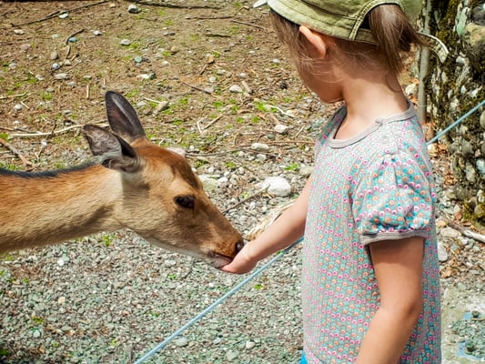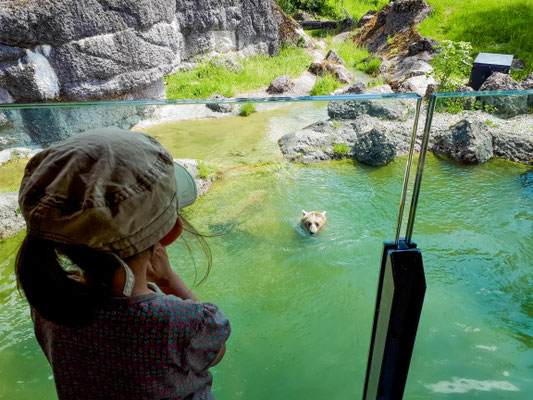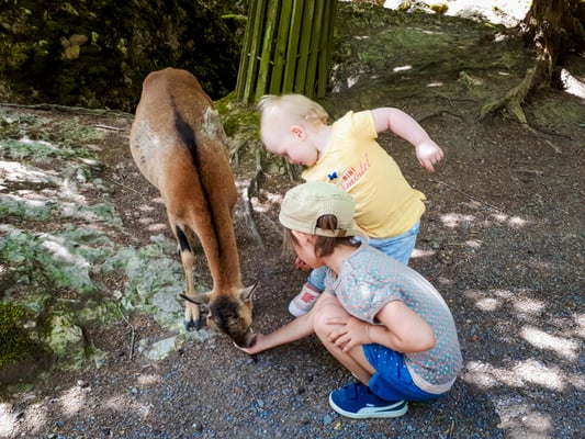 Angekommen im Tierpark Goldau haben wir alle eine kleine Futterbox erhalten, mit der wir die freilaufenden Rehe füttern konnten. Wir konnten es kaum erwarten und gingen direkt auf sie zu. Das Füttern und Streicheln der Rehe war ein großes Highlight. Beim Weitergehen entdeckten wir im großen Gehege den schlafenden Wolf. Der Bär war jedoch nirgends zu sehen. Erst kurz vor dem Picknick haben wir dann endlich den Bären bei seinem täglichen Bad gesichtet.