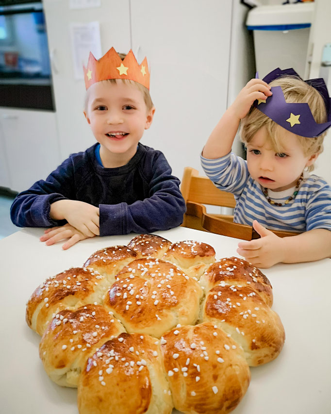 Unser Kuchen musste noch ein wenig abkühlen und in der Zwischenzeit trafen wir uns im Zvierikreis und assen unseren Früchteteller. Nach dem Kreis begaben wir uns ins Esszimmer wo unser Königskuchen und unsere selbstgemachten Kronen schon bereitstanden. Wir setzten uns zusammen an den Tisch und jeder durfte sich eine Kugel aussuchen und vom Kuchen abbrechen. Sofort haben wir angefangen den König in unseren Stücken zu suchen.