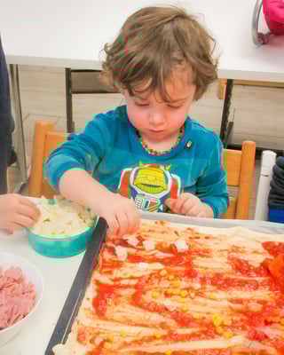 Seit einer Woche haben wir das Thema „Kochen und Essen“ bei uns in der Kita. Heute waren wir sehr gespannt, was nun an der Reihe ist. Gemeinsam setzten wir uns in den Kreis und haben interessiert zugehört was Nicole uns erzählte. Sie sagte, dass wir heute bei unserem Mittagessen mithelfen können. Als wir noch hörten, dass es PIZZA gibt, haben wir uns riesig gefreut. Bevor wir in die Küche gingen, haben wir gemeinsam das Spiel: „Pizza belegen“ gespielt - immer ein Kind darf sich auf den Bauch legen und ein anderes Kind darf auf seinem Rücken eine Pizza belegen.
