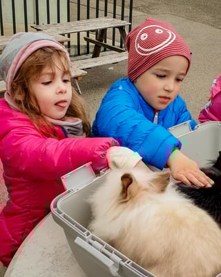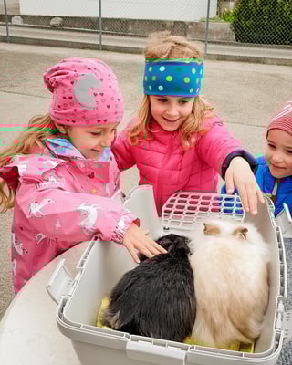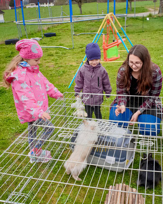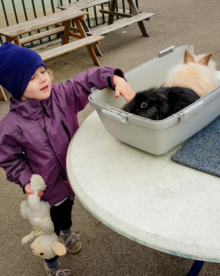 Plötzlich kam Laura am Morgen mit einer Box in die Kinderkrippe. Wir freuten uns so sehr, dass wir direkt zu ihr gesprungen sind um die Hasen durch die Box zu beobachten. Laura hat uns gesagt, dass wir das Gehege für die Hasen gemeinsam aufstellen, damit sie draussen im Garten spielen können. Wir zogen unsere Schuhe und Jacken an, damit wir schnell im Garten waren und beim Aufstellen des Geheges helfen konnten. Bevor die Hasen aber im Gartengehege rumspringen konnten, wollten wir sie unbedingt ohne Box sehen und sie streicheln, deshalb öffnete Laura die Box und die beiden Hasen schauten heraus. Wir konnten sie endlich richtig sehen! Wir durften alle nacheinander die Hasen streicheln und ihr weiches Fell spüren. Wir wussten, dass wir ganz leise sein müssen, damit sie nicht Angst vor uns haben, trotzdem mussten wir aber laut lachen, als sie an unseren Händen schnüffelten und uns anschauten. Nachdem wir sie alle gestreichelt haben, schloss Laura die Box nochmals und ging mit uns zum Gehege. Dort legte sie die Hasen mit der Box hinein und öffnete das Türchen. Wir warteten gespannt, bis die Hasen herauskamen und herumsprangen. Ab jetzt sind endlich die Hasen da und wir freuen uns sehr, sie bei uns in der Kinderkrippe zu haben.
