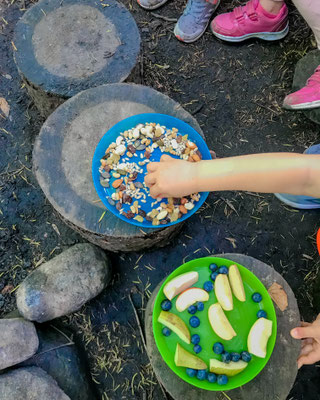 Passend zum Thema „Was essen die Vögel“ assen wir zum Snack verschiedene Nüsse, Beeren, Äpfel und Birnen.