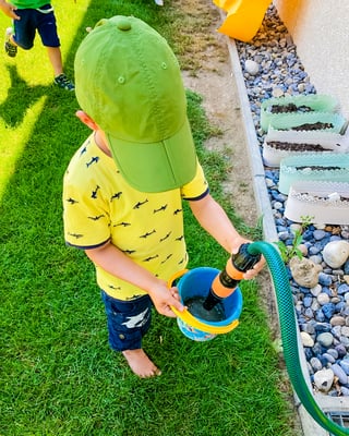 Zusammen bauen wir ein Loch mit Schaufeln und Kesseln, holen Wasser und füllen damit das Loch. Tadaa, unser See ist gebaut. Auch einen Berg bauen wir, machen ein Loch oben in der Mitte, füllen vorsichtig Wasser hinein und schon haben wir einen Vulkan. Die heissen, kleinen Sandkörner legen wir auf den Rand des Vulkans und stellen das Lava dar. Einige Zeit später bricht der Vulkan sogar aus. Hui, das gibt eine Überschwemmung im Sandkasten. Wir finden dies toll, da sich die Mischung zwischen Wasser und Sand gut anfühlt an den Füssen und Händen.