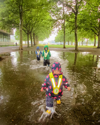 Wir haben uns nach dem Morgenkreis in der Garderobe gesammelt und haben unsere Regenausrüstung angezogen. Regenhosen, Gummistiefel und Regenjacken. Nun waren wir bereit, um uns im Regen auszutoben. Mit grossen Augen erwarteten wir unser kleines Regenabenteuer und waren gespannt, was wir dabei entdecken und erleben würden. Voller Vorfreude nahmen wir uns an der Hand und gingen gemeinsam  los. Bereits auf dem Weg fiel der Regen in grossen Tropfen auf uns herunter. Nun mussten wir nur noch eine geeignete Pfütze für unseren Ausflug finden. Doch das war heute zum Glück gar nicht so schwer. Der grosse Platz, zu dem die Kita-Frauen uns brachten, bot einige riesige Pfützen, welche unsere Entdecker-Herzen höher schlagen liess. Wir versuchten die Tropfen mit den Händen zu fangen. Das machte uns viel Spass. Beim In-die-Pfütze-springen schien es so, als ob die Tropfen auf einmal von allen Richtungen kämen. Es machte Plitsch-Platsch von oben, von unten und von allen Seiten. Wir haben auch mal mit den Händen in der Pfütze geplantscht. Und wir rannten, hüpfen, stampften und setzen uns mitten in die Pfützen hinein. So verflog die Zeit leider viel zu schnell und wir mussten wieder zurück in die Kita gehen, da es Mittagessen gab. Hand in Hand machten wir uns auf den Rückweg und mussten zugeben, dass wir davon schon ziemlich hungrig geworden waren. Was es heute wohl Leckeres gibt?