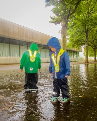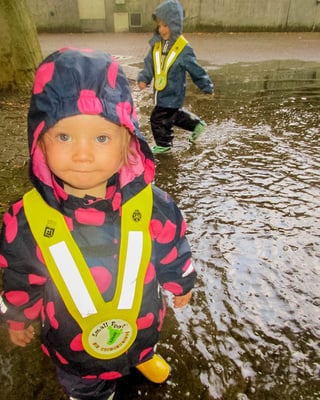 Wir haben uns nach dem Morgenkreis in der Garderobe gesammelt und haben unsere Regenausrüstung angezogen. Regenhosen, Gummistiefel und Regenjacken. Nun waren wir bereit, um uns im Regen auszutoben. Mit grossen Augen erwarteten wir unser kleines Regenabenteuer und waren gespannt, was wir dabei entdecken und erleben würden. Voller Vorfreude nahmen wir uns an der Hand und gingen gemeinsam los. Bereits auf dem Weg fiel der Regen in grossen Tropfen auf uns herunter. Nun mussten wir nur noch eine geeignete Pfütze für unseren Ausflug finden. Doch das war heute zum Glück gar nicht so schwer. Der grosse Platz, zu dem die Kita-Frauen uns brachten, bot einige riesige Pfützen, welche unsere Entdecker-Herzen höher schlagen liess. Wir versuchten die Tropfen mit den Händen zu fangen. Das machte uns viel Spass. Beim In-die-Pfütze-springen schien es so, als ob die Tropfen auf einmal von allen Richtungen kämen. Es machte Plitsch-Platsch von oben, von unten und von allen Seiten. Wir haben auch mal mit den Händen in der Pfütze geplantscht. Und wir rannten, hüpfen, stampften und setzen uns mitten in die Pfützen hinein. So verflog die Zeit leider viel zu schnell und wir mussten wieder zurück in die Kita gehen, da es Mittagessen gab. Hand in Hand machten wir uns auf den Rückweg und mussten zugeben, dass wir davon schon ziemlich hungrig geworden waren. Was es heute wohl Leckeres gibt?