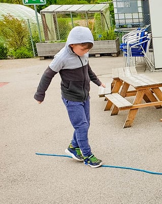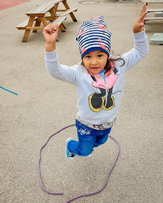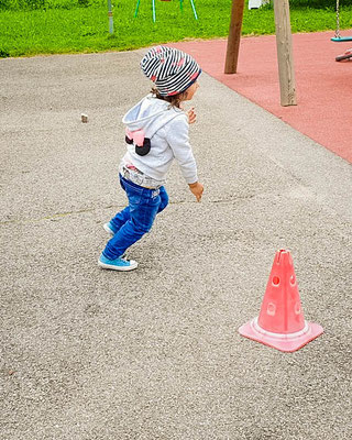 Wir Kinder waren heute voller Energie, brauchten deshalb viel Bewegung und wollten uns auspowern. Zuerst machten wir aber einen Kreis auf dem roten Teppich und die Frauen erzählten uns, dass sie eine Überraschung für uns vorbereiten und wir freuten uns riesig, als wir davon hörten. Franziska ging in den Garten und bereitete die Überraschung vor und die anderen Frauen gingen gemeinsam mit allen Kindern in die Garderobe um Jacke, Schuhe und Mützen anzuziehen. Als alle Kinder mit dem Anziehen fertig waren, sprangen wir in den Garten um zu schauen, was Franziska macht. Wir sahen Seile, Matten und Verkehrshütte und fragten uns, was wir wohl damit machen werden. Franziska rief uns alle zusammen und wir setzten uns gemeinsam auf den großen Traktorpneu. Weil wir Energie brauchten, tranken wir zuerst Wasser um uns so zu stärken für das was wir vorhatten. Franziska erklärte uns, dass wir einen Parcours machen dürfen und das größte Kind durfte ihn mit Franziskas Hilfe vorzeigen. Kriechen, hüpfen, springen und balancieren macht Spaß, schnell und langsam mit Klein und Groß genauso. Die anderen Kinder und Frauen feuerten uns an, wenn wir den Parcours machten, so dass wir noch schneller im Ziel auf den Traktor-Pneu sitzen. Gemeinsam machte der Parcour richtig Spass.