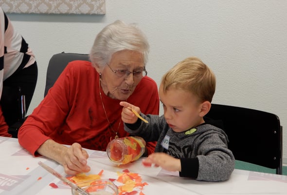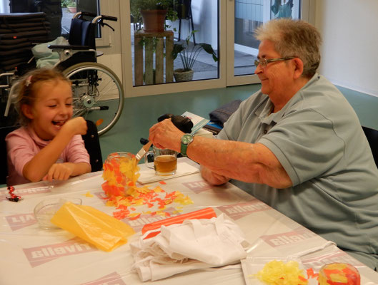 Dieses Jahr hatten wir das Vergnügen uns mit den Senioren im Altersheim in Rothrist zu treffen. Laura hat unsere Mamis und Papis darüber informiert und uns hat sie viele Bilder von älteren Leute gezeigt. Wir wissen jetzt, dass sie manchmal nicht mehr so gut sehen, hören und laufen können und mehr Falten als wir haben. Wir konnten es kaum erwarten bis wir endlich ins Altersheim gehen können. Wir haben vorher viele Lieder geübt und den Senioren diese unbedingt vorsingen. Plötzlich war der grosse Tag da, wir waren den ganzen Tag kribbelig und konnten nicht mehr bis zum Nachmittag warten und haben die Frauen immer wieder gefragt wann es dann endlich soweit ist und wir ins Altersheim gehen können. Am Nachmittag sammelten wir uns im Garten und weil wir so aufgeregt waren sprangen wir noch herum, bis die Frauen uns ruften, weil wir auf den Bus mussten. Die Busfahrt dauerte diesmal so lange, weil wir endlich dort sein wollten. Gemeinsam liefen wir durch den Hinterhof, dort sahen wir Bäume, Wasser und viele Gesichter die durch ein grosses Fenster schauten und deshalb winkten wir ihnen zu. Wir liefen weiter und dort sahen wir eine Frau die uns anlächelte und begrüsste. Wir haben alle unsere Namen gesagt, damit wir wissen wie alle heissen. Danach hörten alle gespannt zu und wir konnten endlich unser Lied vorsingen, die Senioren klatschen dann. Sie sangen sogar für uns ein Lied vor, das wir noch nie gehört haben und wir klatschten dann auch. Dann fing das Basteln an, wir halfen uns gegenseitig dabei und manchmal bastelten wir auch alleine. Nachdem basteln konnten wir die Händewaschen und sahen ein leckeres z’Vieri. Wir haben alle gemeinsam z’Vieri gegessen und viel gelacht, geredet und die älteren Leute angeschaut. Nachdem z’Vieri mussten wir und die Senioren leider schon gehen, wir wären am liebsten noch länger geblieben. Wir hatten einen richtig tollen Nachmittag und freuen uns wenn wir sie endlich wieder besuchen können.