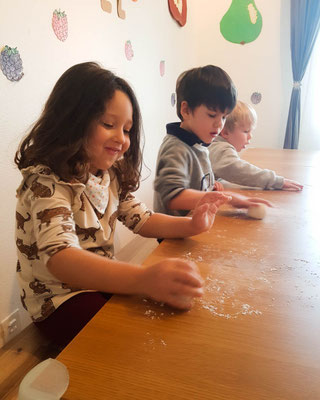 Zuerst bereiteten wir mit Olivia zusammen den Teig vor. Dieser klebte ganz fest an unseren Händen. Danach war Pause angesagt, denn der Teig musste Ruhen und ganz gross werden. Gespannt verfolgten wir dieses Ereignis. Nach langem Warten konnten wir endlich weiter machen. Wir formten den Teig zu einem Kranz und steckten Rosinen hinein.