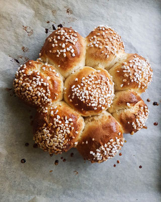 Der Hagelzucker durfte natürlich auch nicht fehlen. Endlich wanderte unser Kunstwerk in den Ofen. Nun hiess es abwarten. Der Duft war Himmlisch. Wir schauten gespannt wie sich der Teig goldbraun färbte.