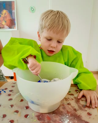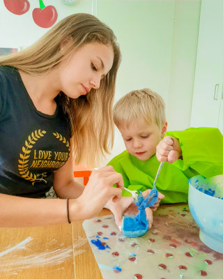 An einem wunderschönen, sonnigen Tag sangen wir unsere Lieder im Morgenkreis. Die Frauen hatten drei Töpfe mit einem Tuch überdeckt in die Mitte von uns gestellt. Wir fragten uns was es wohl sein könnte, doch zum Glück lüfteten sie das Geheimnis schnell. Es war Gips, Wasser und Plakatfarben. Sie fragen uns was man wohl mit dem machen könnte. Wir kamen auf die Idee, dass wir vielleicht selber Knete machen.