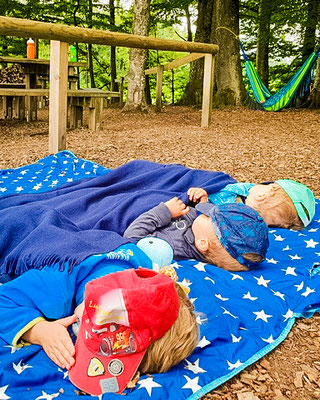Gemeinsam assen wir das z’Mittag. Nach dem Essen schliefen wir auch im Wald oder machten Pause. Ob in der Hängematte oder auf der Decke. Wir geniessten den Schatten und hörten dem Vogelgezwitscher und den rauschenden Blättern zu.