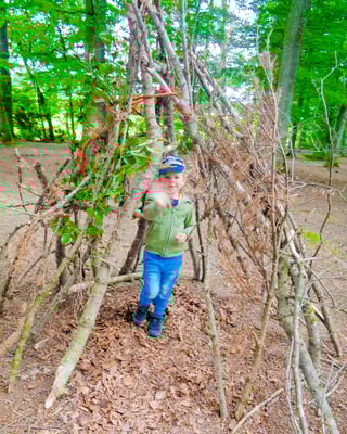 miteinander zusammen. Aus den gesammelten Ästen bauten wir mit Hilfe der Betreuerinnen und Seilen eine Hütte. Einmal ist die Hütte eine Dinosaurier Höhle, danach ein Ninja Haus und auch ein Haus