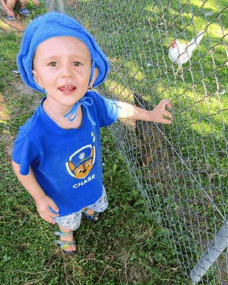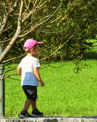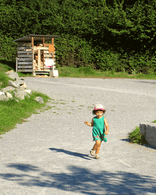 Der Weg zum Themenspielplatz ist autofrei. Somit können wir ohne an der Hand gehalten zu werden gehen und die Umgebung erforschen.