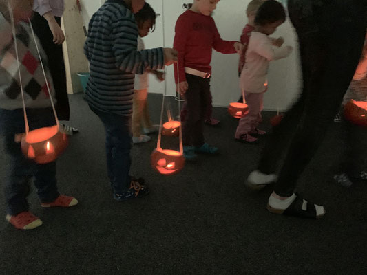 Wir bekamen alle eine kleine Kerze, welche wir in den Kürbis legen durften. Danach wurde es plötzlich dunkel. Alle Storen liessen wir runter. Die Betreuerinnen zündeten unsere Kerzen an und vorsichtig machten wir unseren eigenen Umzug in der Kita!