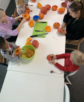 Viele orange Kürbisse warteten auf dem Tisch auf uns.