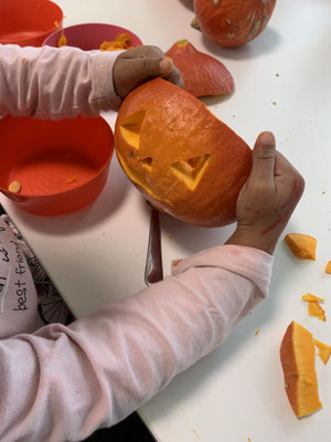 Danach durften wir uns aussuchen, wie die Betreuerinnen unseren Kürbis schnitzen sollen.