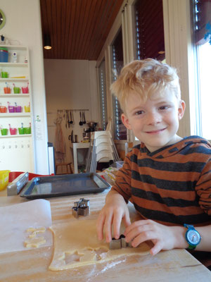 bereitgestellt. Ein Teigroller, Mehl, Ausstechformen und ein Blech mit Backpapier. Wir rollen den Teig aus und stechen dann Guetzli aus. Ein Engel, Sterne, Tannenbäume, Schneemänner und