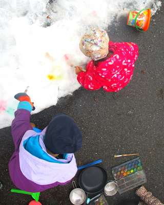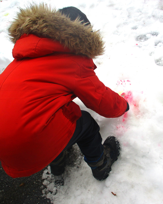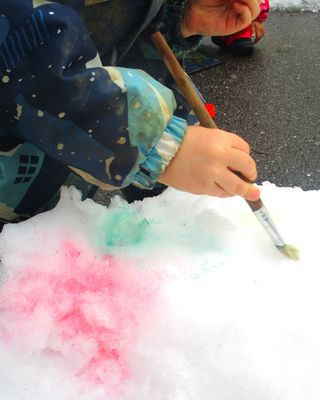 Also ziehen wir unsere Schneesachen an - Mütze, Handschuhe und den Schal nicht vergessen. Wir warten, bis alle bereit sind und dürfen dann in den Schnee, welcher bereits draussen auf uns wartet. Wir freuen uns riesig, doch als wir gesehen haben, was uns Michelle von drinnen nach draussen mitbringt, sind wir fast geplatzt vor Freude – Wir durften den Schnee an malen!