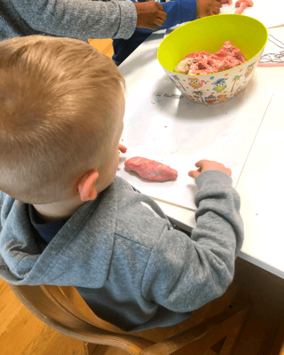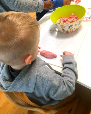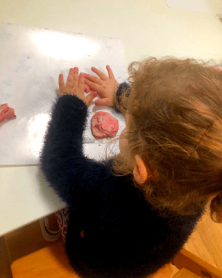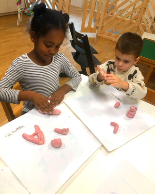Für die Sequenz bat uns Rajina an den Tisch. Jeder von uns bekam eine Unterlage, damit der Tisch nicht schmutzig wird. Anschliessend verteilte uns Rajina bunte Kugeln aus Salzteig welchen wir lange ausrollten damit wir unsere Anfangsbuchstaben gut formen konnten.