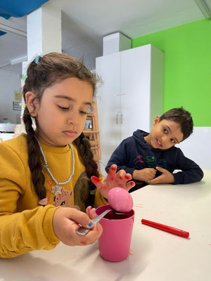 Dana hat uns auch erklärt das wir ganz vorsichtig sein müssen und auf die Eier achtgeben sollen denn sonst könnten sie kaputt gehen. Danach konnten wir sofort mit dem Eierfärben loslegen. Es hat uns sehr Spass gemacht und unsere Eier waren nun nicht mehr weiss sondern bunt.
