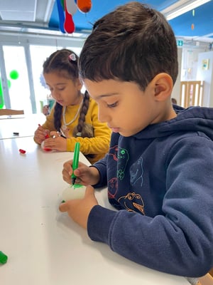 Wir sind alle aufgesprungen und gemeinsam zum Tisch im Gruppenraum gegangen. Dort hat unsere Betreuerin Dana bereits alles für uns bereitgestellt verschiedene Farben Eier und Malstifte.