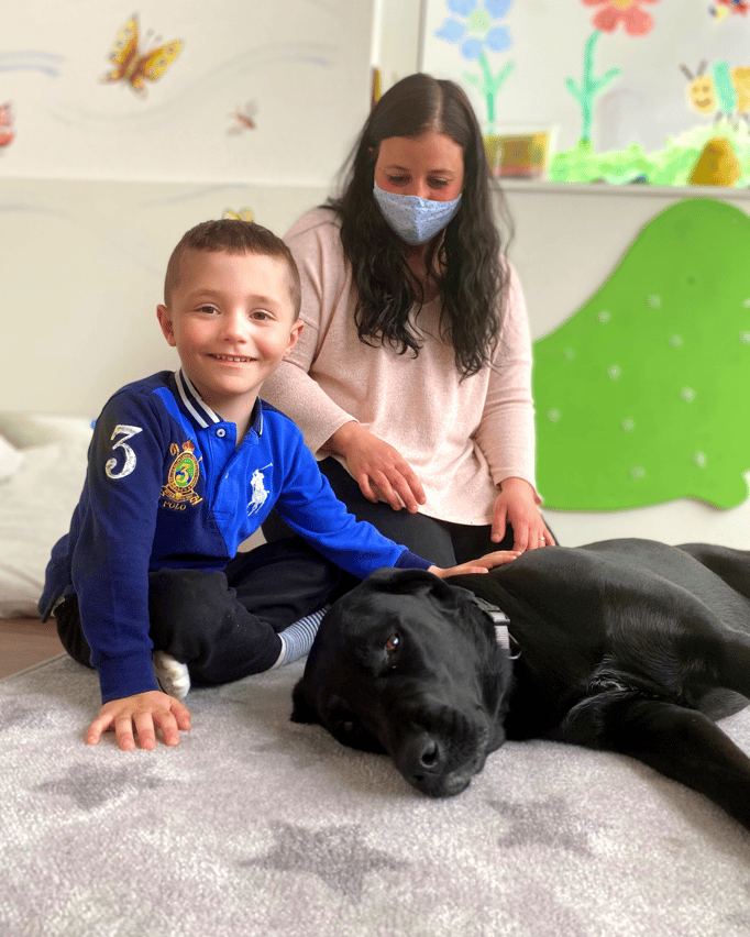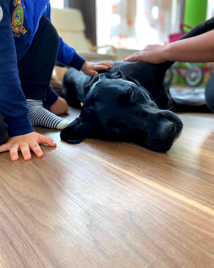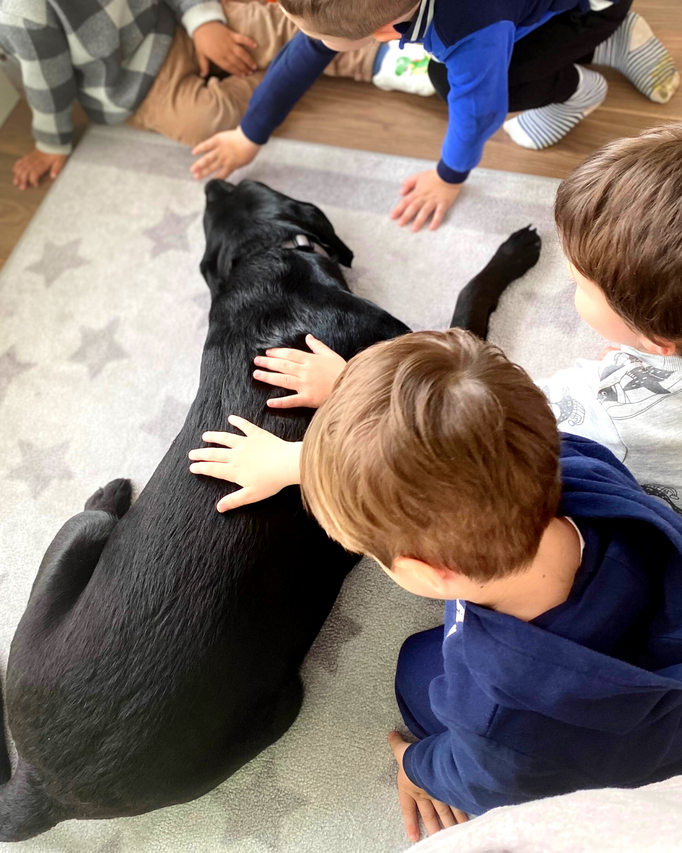 Gemeinsam mit den Betreuerinnen begrüssten wir Nala im Kreis. Nala legte sich gleich in die Mitte des Kreises und liess sich von uns Kinder nacheinander streicheln.
