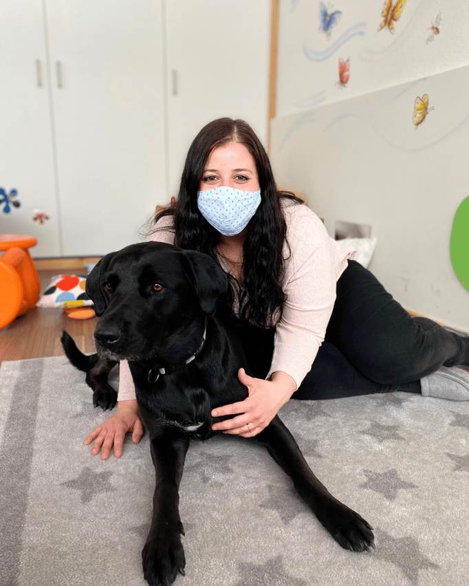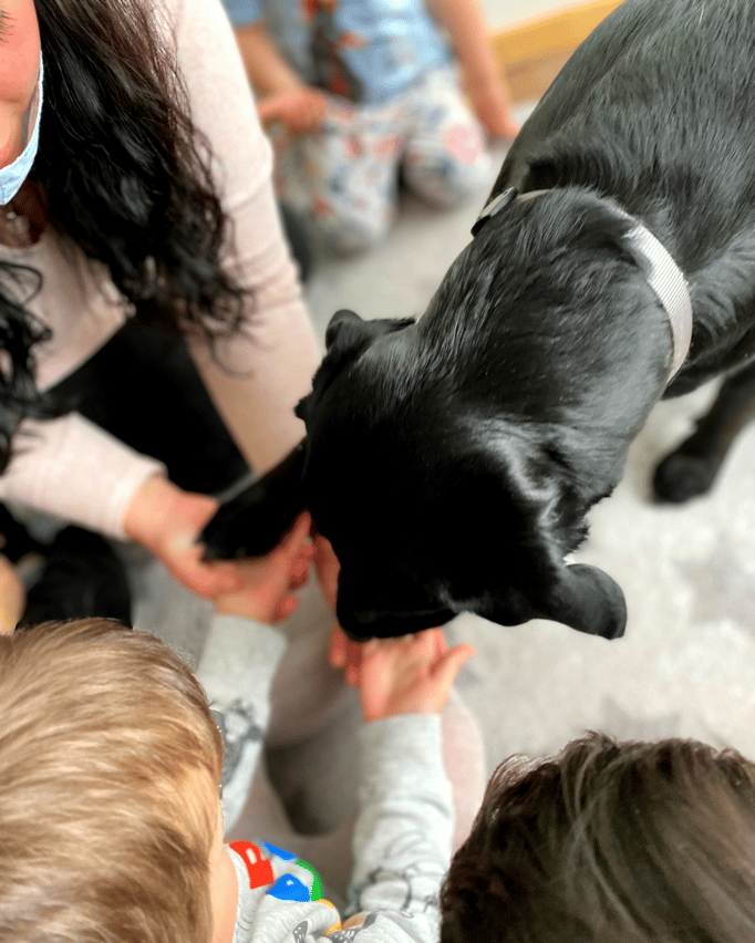Die Besitzerin von Nala, die unsere Krippenleiterin ist, zeigte uns, dass wir Nala zuerst an unserer Hand riechen lassen, bevor wir sie streicheln. Sie zeigte uns auch, wo Nala besonders gerne