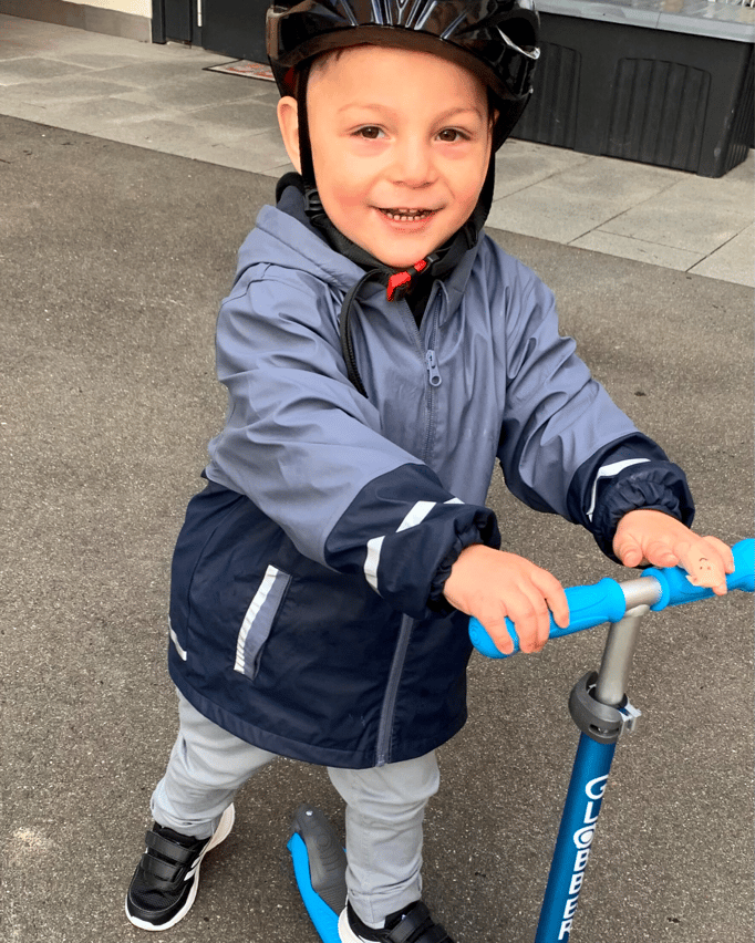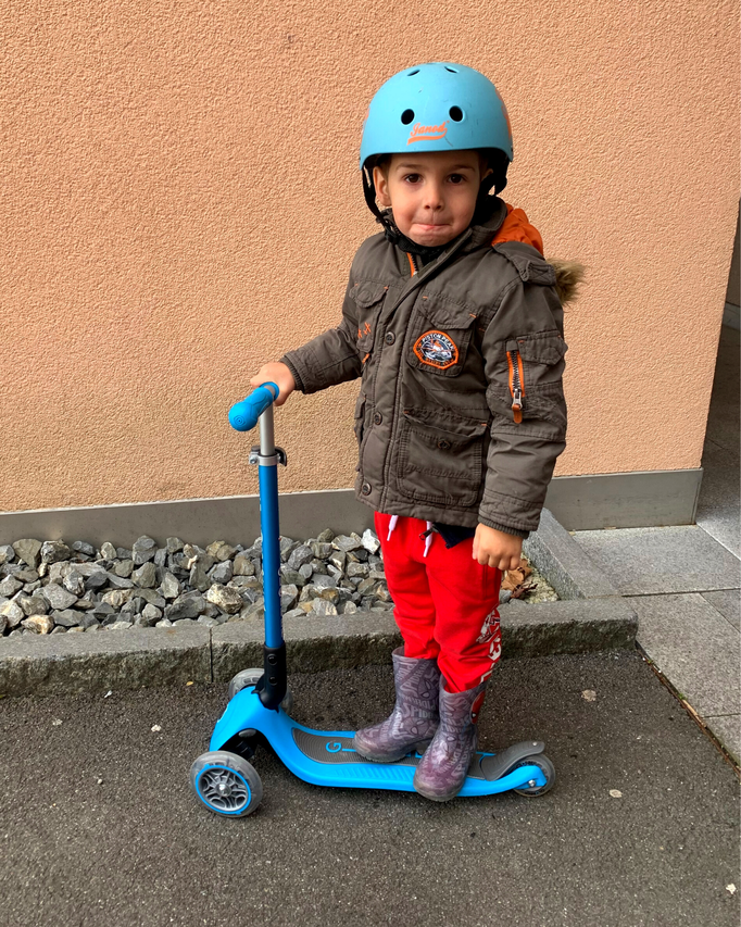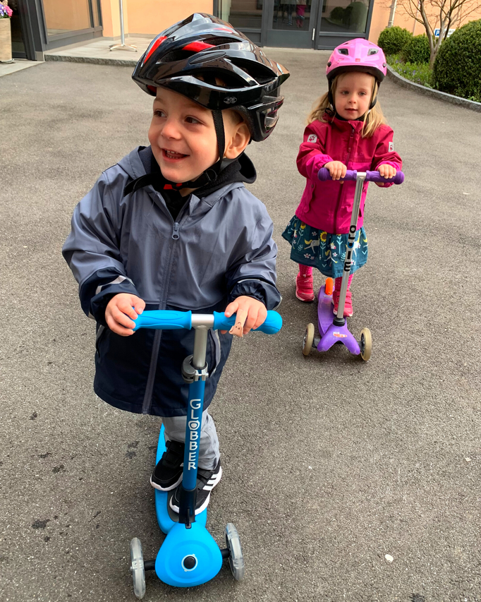 Nun ziehen wir uns an und gehen auf unserem grossen Vorplatz mit dem Trotti und können endlich fahren. Loss kann es gehen, wir fahren ganz schnell, denn wir haben den Kita Frauen sehr gut
