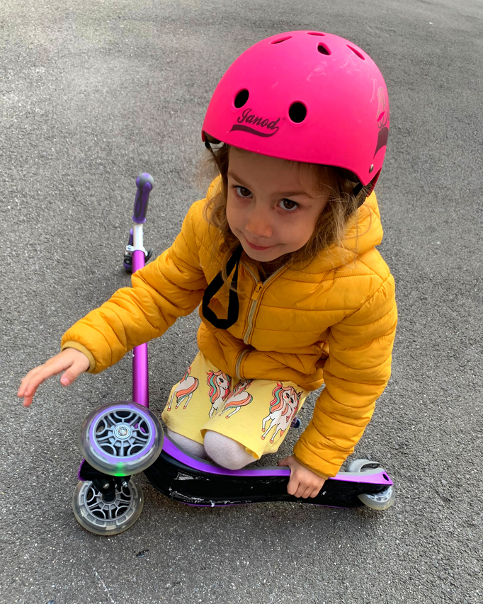 Wir ziehen geschlossene Schuhe und einen Helm an. Damit unser Helm gut passt, legen wir zwei Finger auf die Stirn, darüber sollte sich die Vorderkante des Helms befinden. Das Trotti stellen wir so ein, dass der Lenker auf der Höhe unseres Bauchnabels ist. Zum Schluss zeigt uns die Kita Frau noch, wie man richtig auf dem Trotti steht, Fuss ganz nach vorne und ein wenig in die Knie.