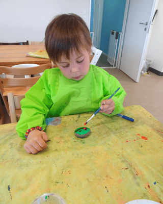 Damit die Kaulquappen sich bei uns wohlfühlen haben wir die Steine grün angemalt und mit Augen und Mund verziert und so Frösche aus ihnen gemacht. Diese Steine haben wir dann ums Froschaquarium