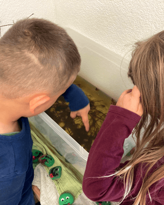 Kaulquappen Hinterbeine bekommen und sind nun zu Froschlurchen heran gewachsen. Wir sind gespannt auf den Moment, an dem sie anfangen umher zu hüpfen und witzeln mit den Kita Frauen darüber, ob