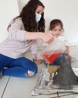 Diesen brauchen wir nämlich für unser aktuelles Wochenthema. Diese Woche dreht sich bei uns alles rund um Dinos und Vulkane. Sharon sagt uns, dass wir mit dem vorbereiteten Salzteig nun einen Vulkan bauen. In der Mitte des Vulkans steht eine Flasche. Sharon erklärt uns, dass wir nachher verschiedene Dinge in die Flasche leeren dürfen.