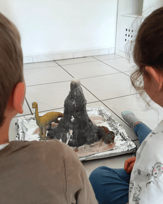 „Achtung, der Vulkan bricht aus!“ ruft Sharon und giesst die Lava in den Vulkan. Sofort hören wir ein zischen und aus dem Vulkan steigt rot schäumende Lava aus. Juhu - dieses Experiment hat uns allen sehr viel Spass gemacht!