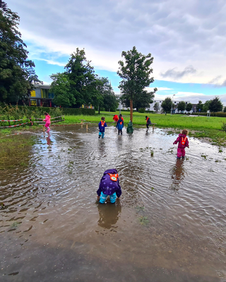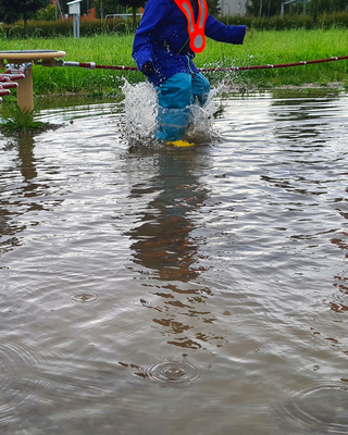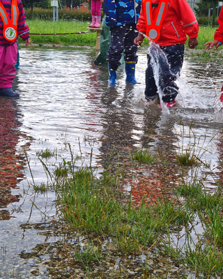 Ach wie ist das toll so eine riesen Pfütze. Zum Glück sind wir alle gut bekleidet.