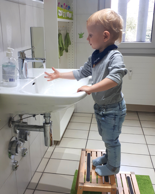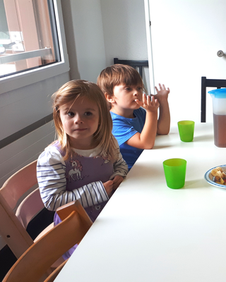 Jeweils vor den Mahlzeiten gehen wir alle gemeinsam die Hände waschen. Am Tisch winken wir einander zu und wünschen uns ,,en Guete‘‘.