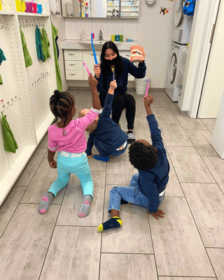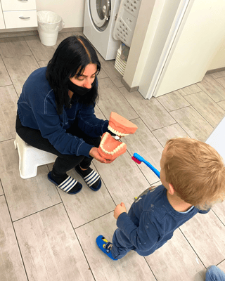 Die Zahnfee packte eine riesige Zahnbürste aus und zeigte am Gebiss, wie man sich richtig die Zähne putzt. Wir machten die Bewegungen mit unserer Zahnbürste bei uns selbst nach. Während wir alle gemeinsam die Zähne putzen, sang sie das Zahnputzlied. Dies bereitete uns so viel Freude, dass wir nicht aufhören wollten.