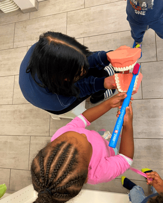 Zum Schluss durften wir alle mit der riesigen Zahnbürste dem Gebiss die Zähne putzen. Am liebsten hätten wir uns den ganzen Nachmittag mit dem Gebiss und der Riesenzahnbürste beschäftigt.