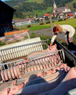 Wir mussten zuerst ein Stück laufen und dann haben wir auch schon die Schweine gesehen, wir freuten uns so dass wir gaaaanz schnell zu ihnen liefen. Die Schweine haben sich wohl auch gefreut uns