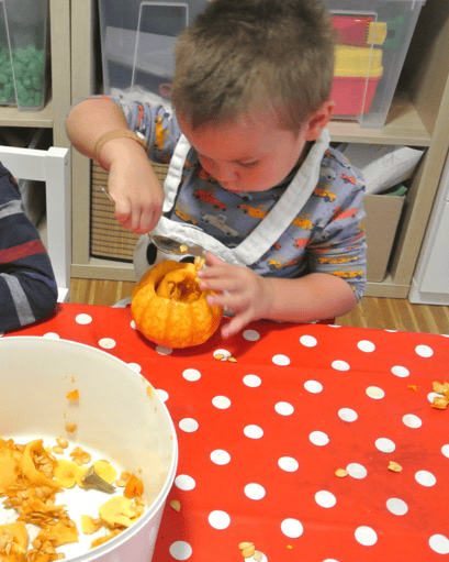 rauslöffeln. Immer wieder haben wir an dem Kürbis gerochen und lustig die 3Gesichter verzogen, als wir das Innenleben mit den Fingern angefasst haben.
