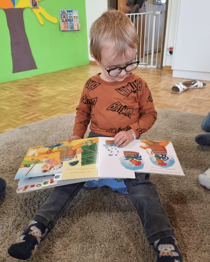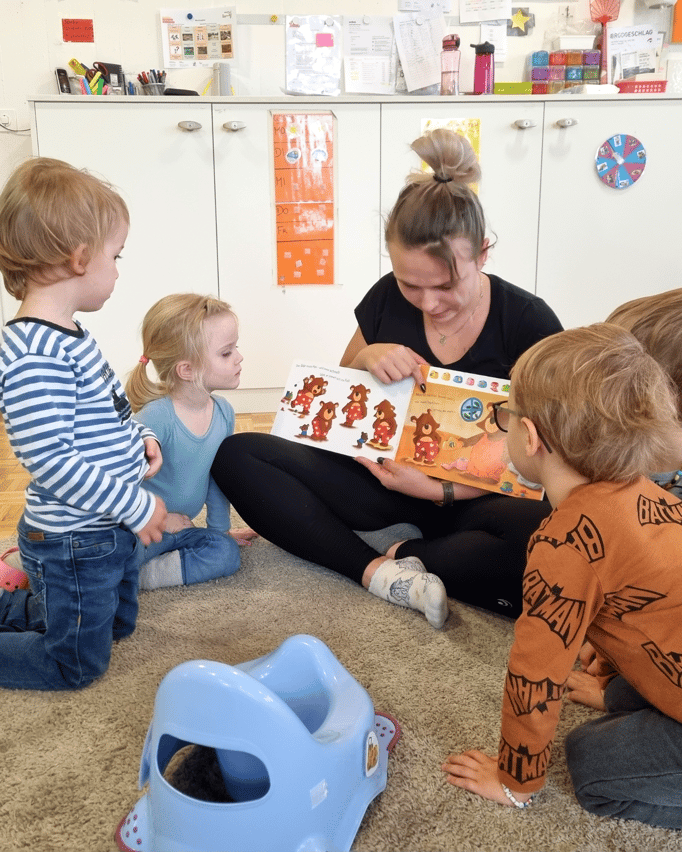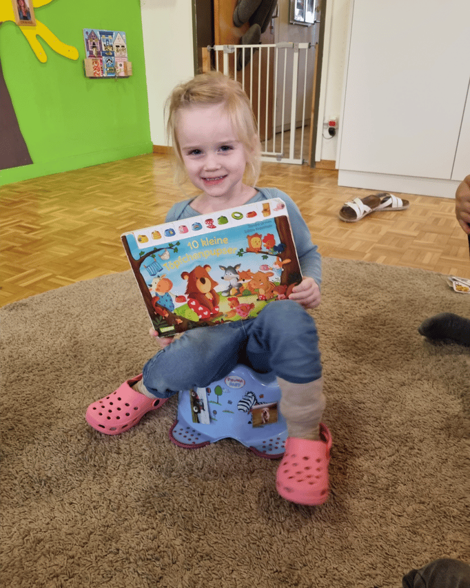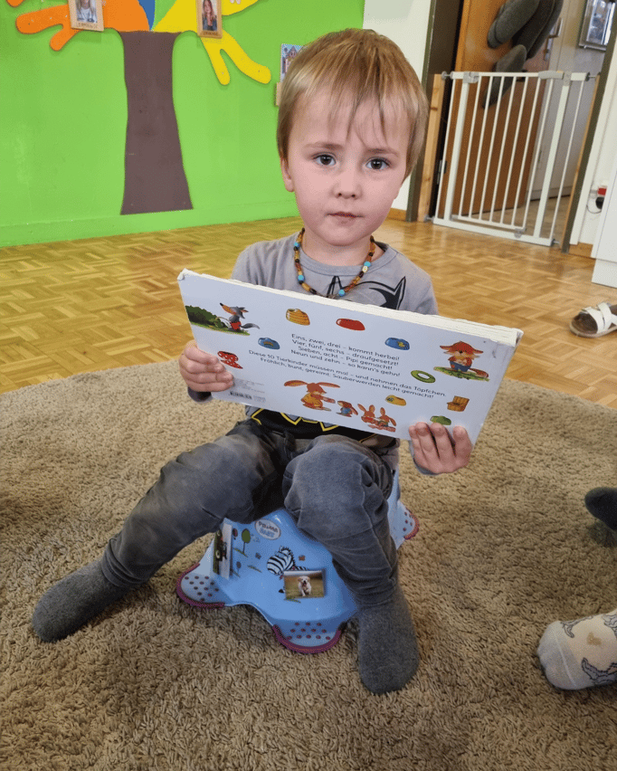 Zu diesem Thema haben wir verschiedene Bücher: „ Zehn kleine Töpfchenpupser“, „Das Ding“ und „Der Klo König“. Aus diesen Büchern erzählen uns die Betreuerinnen und wir hören ganz gespannt zu. Nach den spannenden und lustigen Geschichten dürfen wir unsere Häfis dekorieren. Dafür haben wir verschiedene Motive wie einen Bagger, Lastwagen, Katze, Hund und viele mehr. So steigt die Motivation, aufs Häfi zu gehen.