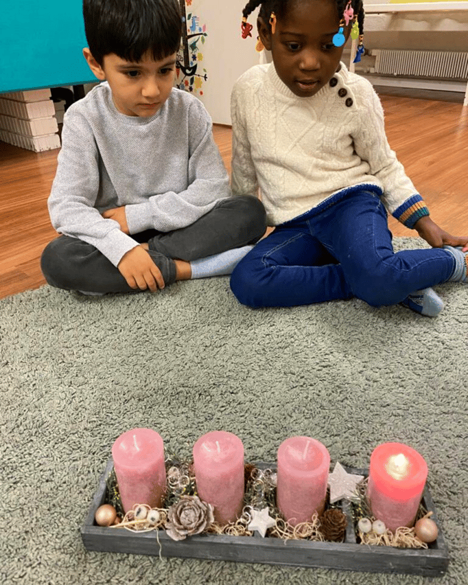 Kita. Dort angekommen sassen wir in den Morgenkreis und zündeten unsere erste Adventskerze an und sangen dazu unsere Winter- und Adventslieder.