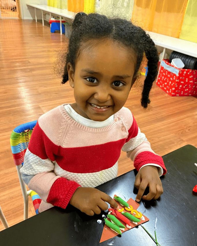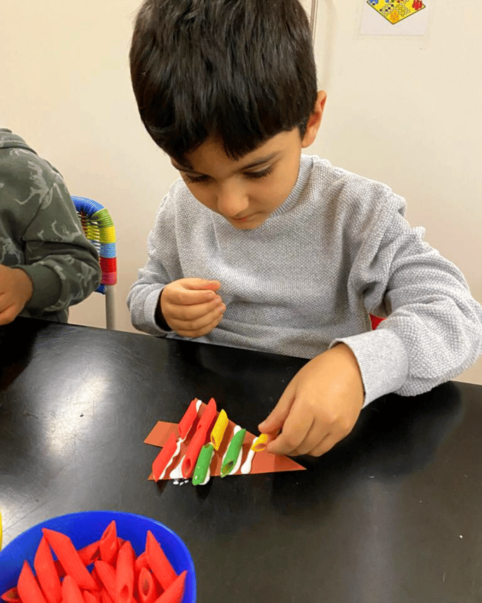 Als nächstes erzählte uns Paula, warum wir die Kerze angezündet haben und was für eine Zeit nun beginnt. Nach dem Morgenkreis durften wir uns an den Tisch setzen, dort bekamen wir ein Dreieck aus Karton und Nudeln welche, die Frauen mit uns letzte Woche gefärbt haben. Diese dürfen wir auf unser Dreieck kleben. Dazu bekamen wir einen Weissleim und durften die Nudeln so darauf kleben, dass es zum Schluss aussieht wie ein Geschmückter Tannenbaum. Paula sagte uns, dass diese kleinen Tannenbäume an unseren Kita Tannenbaum kommen.