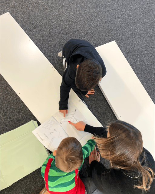 Trotzdem baten wir unsere Hilfe an und waren motiviert, gemeinsam mit Jana diese Platten zusammen zu schrauben. Jana erkläre uns, anhand der Anleitung mit Bildern, wo welche Schraube reinkommt.