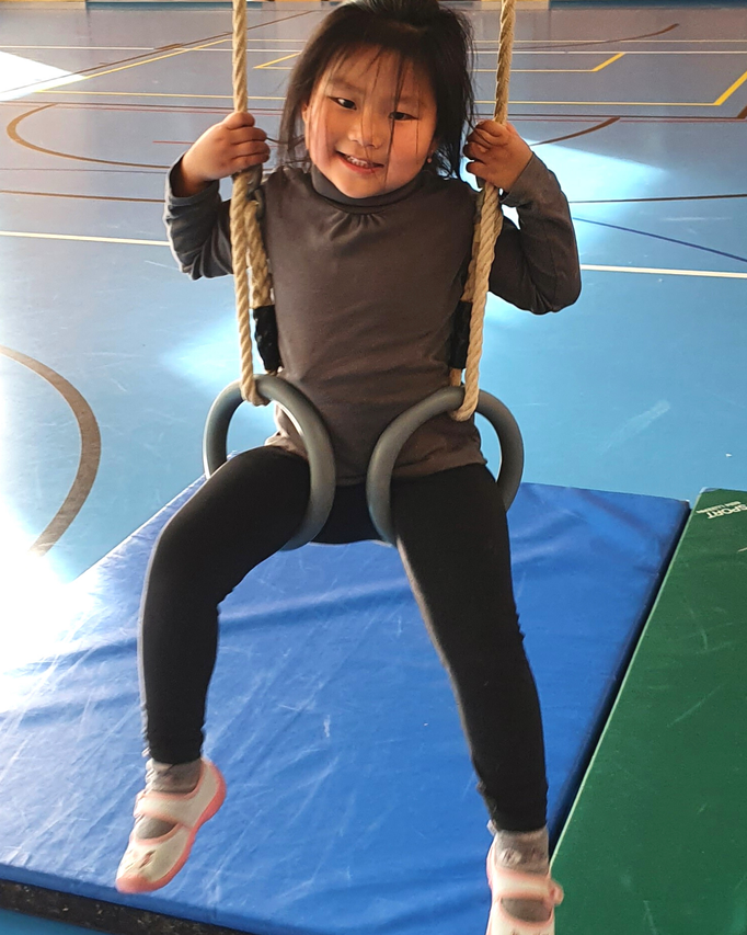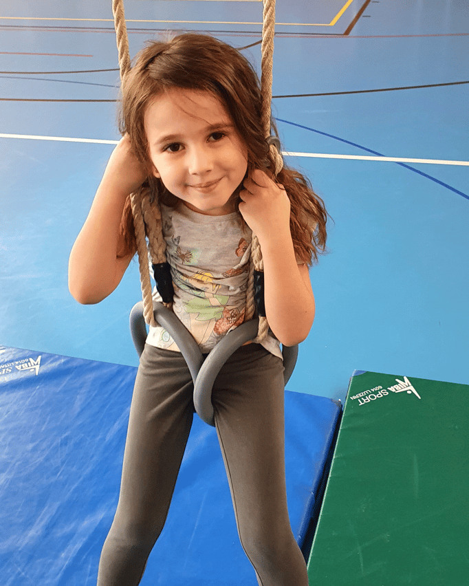 Als die Matten vorbereitet waren, wurden endlich die Ringe hinuntergelassen. Darauf haben wir uns schon den ganzen Morgen gefreut – wir durften in der Turnhalle schaukeln!