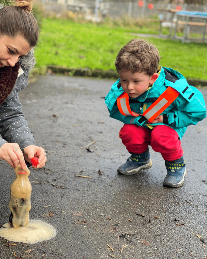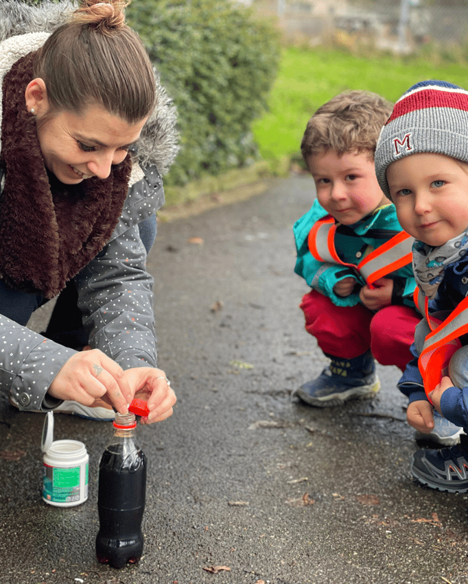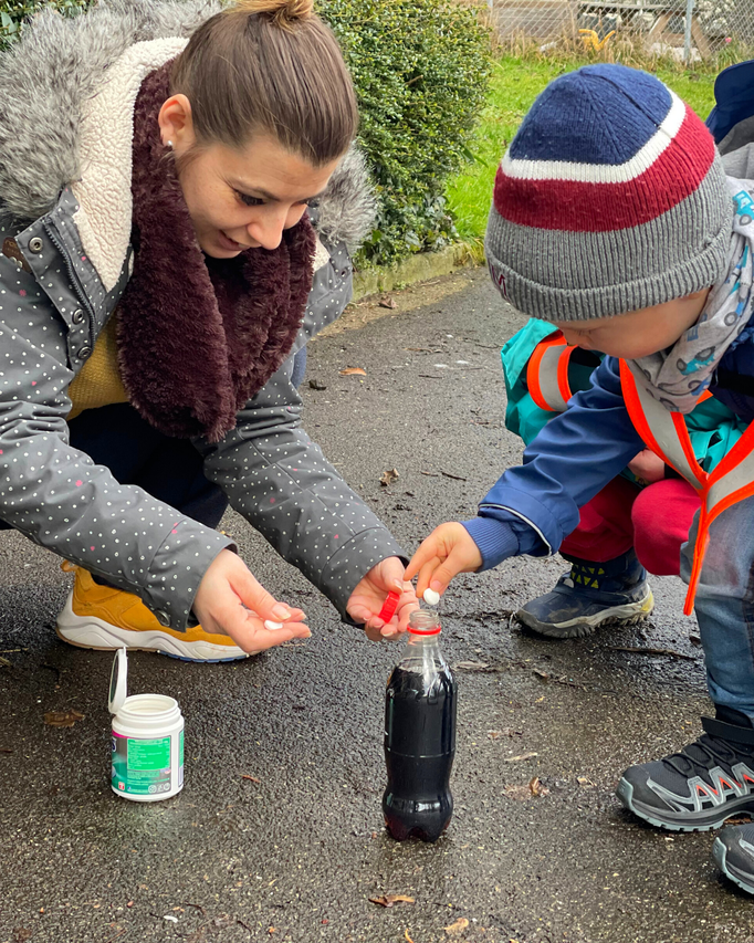 In dieser Ecke finden wir eine Flasche die dunkle Flüssigkeit darin enthält und daneben weisse kleine Kaubonbons vor. Gespannt warten wir bis Catia uns erklärt, was wir jetzt erforschen werden. Sie macht den Deckel der Flasche ab, wir dürfen ein Bonbon nehmen und in die Flasche hinein werfen. Die Flüssigkeit fängt an zu Sprudeln und verwandelt sich in einen lustigen Vulkan.