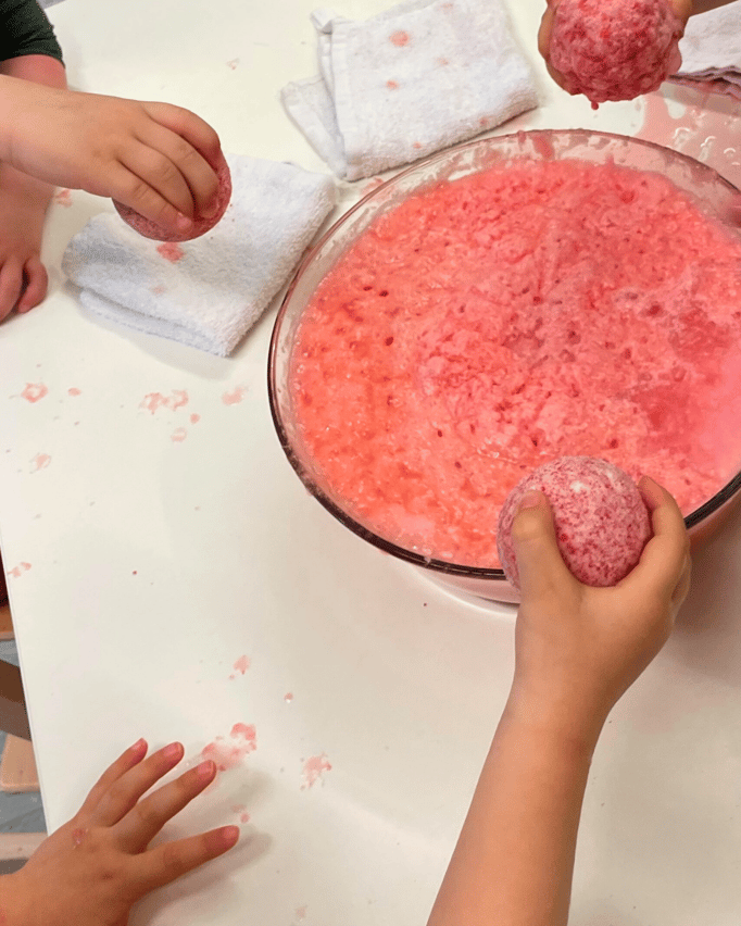 Wir haben gemeinsam lustige Sprudelkugeln aus diversen Haushaltsmittel gemacht.