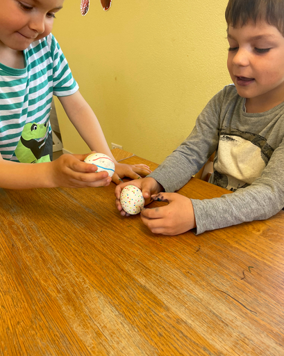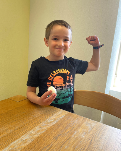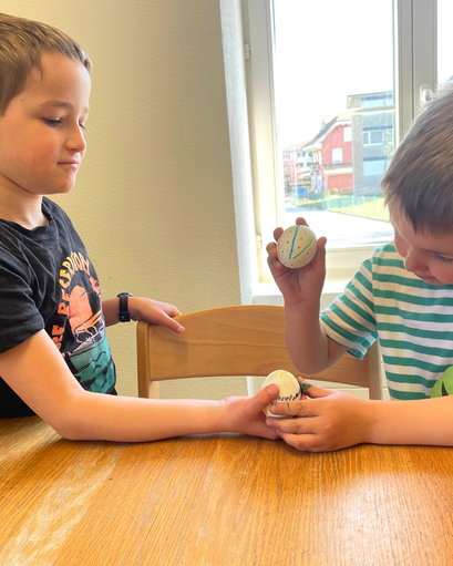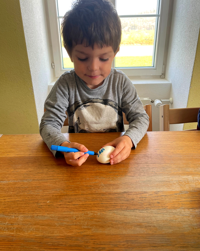 Jedes von uns Kindern durfte 1-4 Eier bemalen, halt so viele wie wir gerade mochten. Das Bemalen war eine neue Erfahrung, da wir die Eier mit Stiften bemalen konnten, ähnlich wie Filzstifte, welche wir normal fürs Basteln oder Malen von Blättern verwenden.