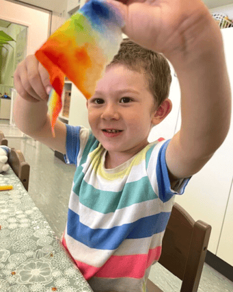 Als erstes konnten wir dann einen Regenbogen auf ein Haushaltspapier malen. Das war gar nicht so einfach, denn wir mussten in der Mitte eine Stelle frei lassen und das Haushaltspapier ist viel weicher und dünner als das normale Papier. Danach haben wir zwei Becher mit Wasser gefüllt und das Haushaltspapier an den Enden in die Becher gelegt. Schon nach kurzer Zeit sahen wir, wie der Regenbogen zu wachsen beginnt und die weisse Stelle in der Mitte langsam auch zum Regenbogen wird. Das war spannend!