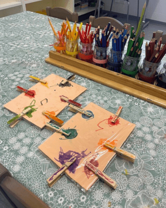 Am nächsten Tag durften wir unser eigenes Farbenspiel basteln. Wir konnten auf ein Blatt Papier viele verschiedenfarbige Punkte malen und danach noch Klammern in der gleichen Farbe bemalen. Schon