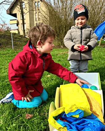 Zuerst haben wir das Tuch ganz wild geschüttelt. So fest wie wir nur konnten. Danach haben wir die kleinen Bälle auf das Tuch gelegt und geschaut, was passiert, wenn wir das Tuch weiterhin schütteln. Die Bälle sind dann ganz wild auf dem Tuch hin und her gesprungen. Mit der Zeit haben wir versucht die Bälle absichtlich ab dem Tuch zu werfen oder so lange wie möglich auf dem Tuch zu behalten trotz dem Schütteln. Das war schwierig, aber sehr lustig.