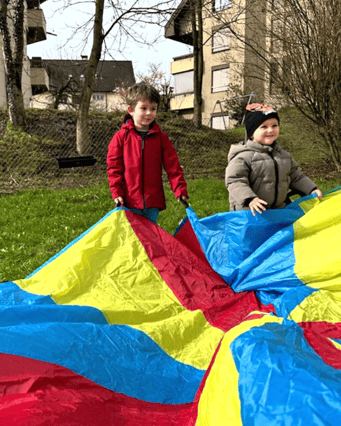 Chiara hat uns dann erklärt, dass man das ein Regenbogen- oder Schwungtuch nennt und gezeigt, dass wir alle das Tuch an den Schlaufen aussen am Rand festhalten und damit Spiele spielen können.